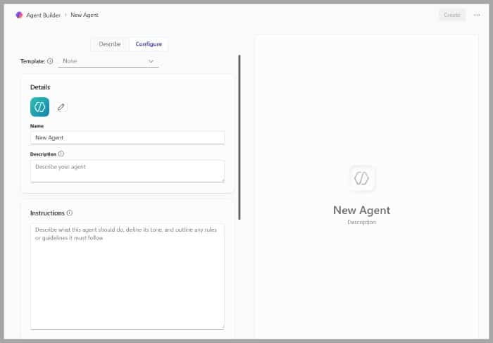 Create agent in Copilot's Agent Builder navigation pane.