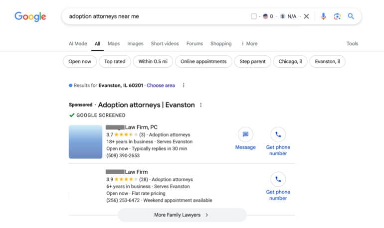 - LSAs: These ads are shown at the very top of the search results, above organic listings and PPC ads. This prominent placement ensures maximum visibility to users who are specifically looking for local services, like a lawyer in their area.