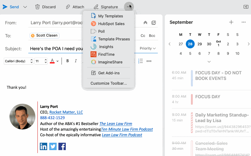 You can use ImagineShare from your favorite browser, just like any other e-signature product on the market. You can also create e-signature documents directly from within your Outlook email. And as its name implies, ImagineShare is also a full-fledged filesharing application, giving you the ability to securely send and request documents directly from within Outlook or your Rocket Matter account. Documents can be password protected to ensure your client’s security and confidentiality.