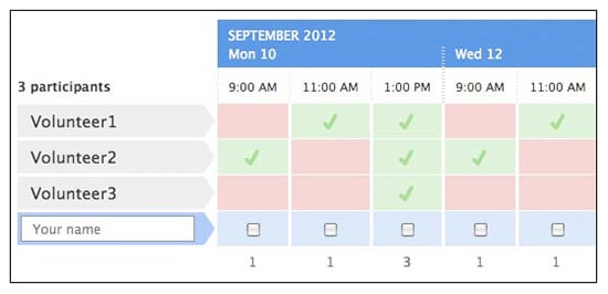 Also, I cannot stress enough how helpful and necessary scheduling tools have become for me and the people with whom I work. It is a painful process to send out an email to 10 people, asking them all for their availability and getting back fragmented, inconsistent responses that take forever to put together. A tool like Doodle makes it dead simple to quickly identify the best time for a meeting (see below) with no emails getting in the way.